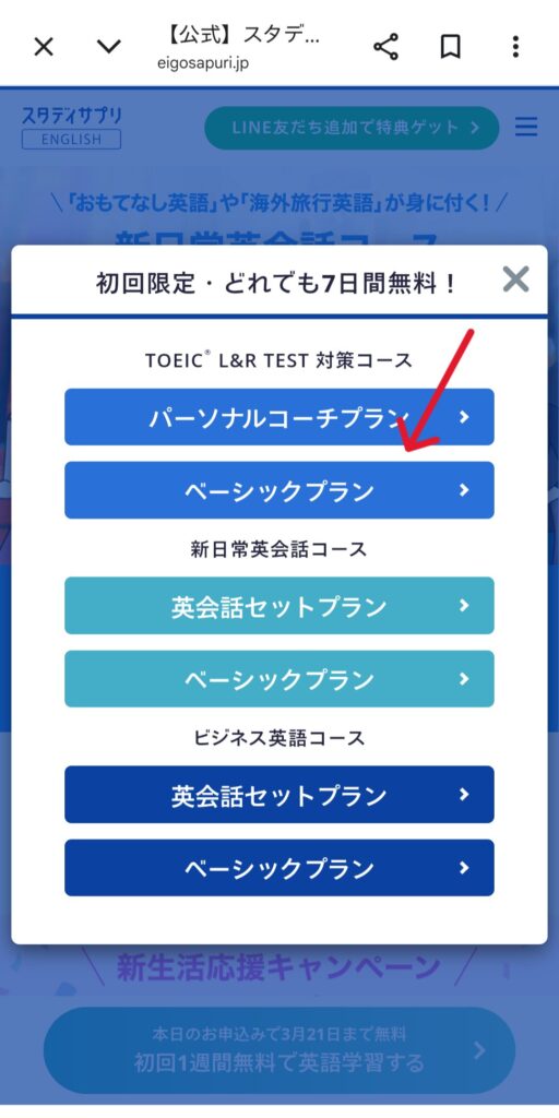 TOEIC L&R TEST 対策コースのベーシックプランを選択します。