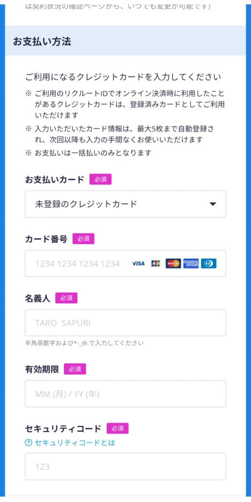 クレジットカード情報を入力して、決済登録を完了させます。